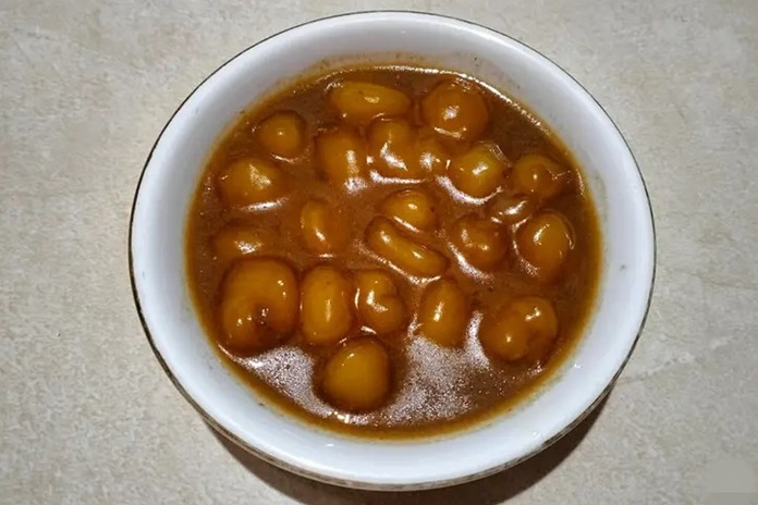 Sebaliknya, bahan dasar utamanya adalah tepung terigu yang diolah menjadi bulatan kenyal, lalu disajikan dalam kuah santan manis yang gurih.
